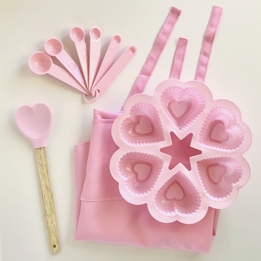 Incluye Delantal, Molde para Muffins de Corazones , Cuchara de Madera con forma de corazon, y cucharas medidoras.